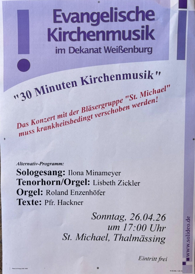 30 Minuten Kirchenmusik Am Sonntag den 26.4.26 findet wieder ein tolles Konzert unter der Leitung von Roland Enzenhöfer in St. Michael in Thalmässing statt. Herzliche Einladung dazu. Weiterlesen über 30 Minuten Kirchenmusik